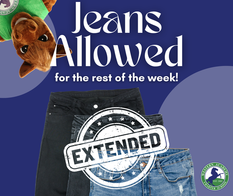 COLD WEATHER UPDATE: JEANS ALLOWED - EXTENDED Due to the cooler temperatures, students may wear jeans for the rest of the week!